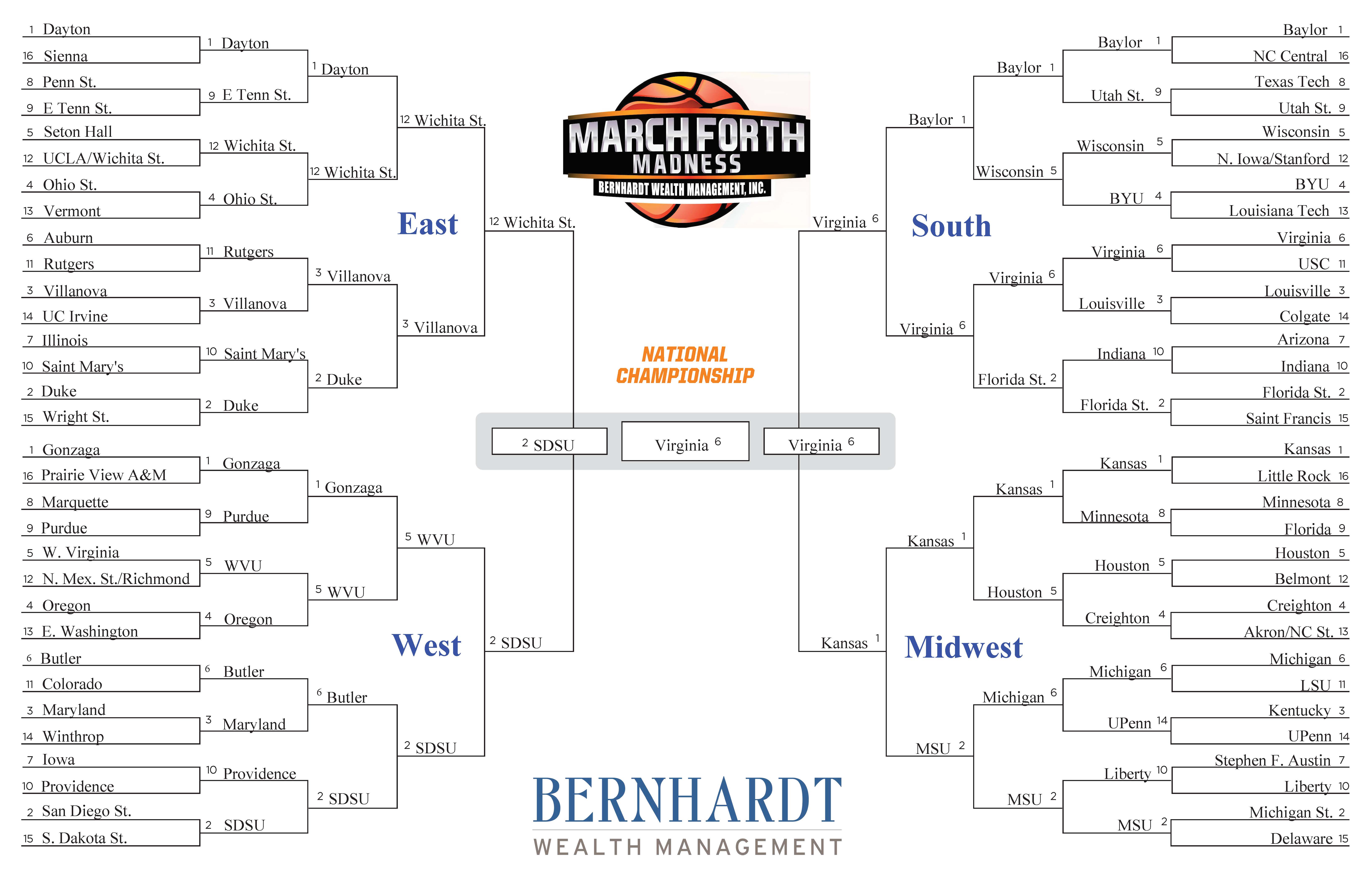 In an interesting side note, we learned of only one perfect bracket for the tournament. Given the number of upsets, you’d assume that nobody would be able to predict 100% of the outcomes, and yet one incredibly astute—or incredibly lucky—fan did just that. Solon Vlasto, a Principal and Senior Advisor with Virginia-based investment advisory firm Bernhardt Wealth Management, turned in the only flawless bracket in the country. Reached for comment after returning from the victorious Virginia locker room, Gordon “Smiley” Bernhardt, President and CEO of the Imaginary National Collegiate Athletics Association, expressed extreme surprise upon learning about Vlasto’s perfect bracket. “In a tournament as crazy as this one has been, that’s really hard to understand,” he said. “I’d like to get this guy to start buying lottery tickets for me.” Vlasto, on the other hand, had a simple explanation. “In our business, we have to predict the future all the time. All I did was polish up and re-calibrate my crystal ball a little bit, and the results speak for themselves.”