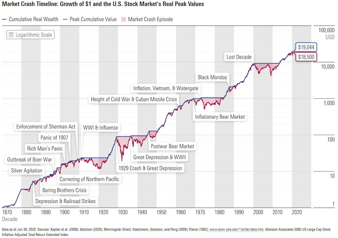 We all know, of course, that everything looks different in the rear-view mirror. Investors experiencing these market downturns—including the one that started last February—weren’t able to predict where the bottom would form or how long it would take to get back to where they were, much less to see further gains. But it is worth remembering that over the last 150 years, a one-dollar investment in the US equity market would have grown to $18,500 by the end of June 2020. As you can see from the chart, we are far from experiencing the pain of some of the more severe downturns of the past, and overall, staying invested through the scary times has turned out to be a winning strategy.
