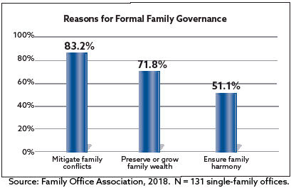 Or it can be done formally, by setting up approaches and controls designed to actively promote the betterment of the family overall. This is the approach we see affluent families take in most instances. The rationale for doing so is to inject some stability into the family’s wealth and potentially head off conflicts that might otherwise arise over money (see the chart).
